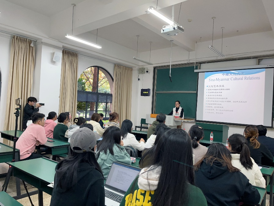 讲座伊始,石瑛译审向师生介绍了她的博士学位论文《中缅文化交流史(1950-2006)》(SINO-MYANMAR CULTURAL RELATIONS)(1950-2006),讲述该选题来源及重要性。随后,详细介绍了中缅两国在文化、艺术、电影、新闻、教育、卫生、体育、旅游、宗教、文学等领域的广泛合作情况。作为中缅文化交流的见证者与亲历者,长期在缅甸工作的石瑛译审以“讲故事”的方式生动介绍了她多次为国家领导人翻译的经历以及为中缅文化交流所作的工作。同时,细致讲述了我国佛牙舍利先后四次赴缅甸巡礼供奉、中国政府援助组帮助缅甸修复蒲甘地区佛塔以及第27届东南亚运动会期间为缅甸提供的诸多援助等中缅文化交流中的具体事例。