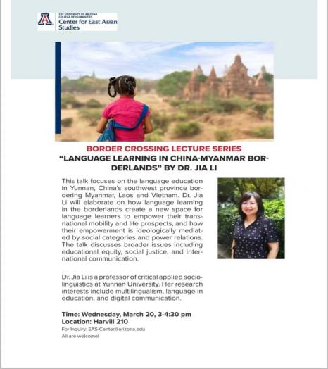 会后永利官网教师受邀前往亚利桑那大学进行为期两天的学术访问。位于美国图森的亚利桑那大学是核心公立大学,被誉为‘公立常春藤’,世界排名97,有21个学院,本次出访交流的研究机构位于人文学院。人文学院的语言文化教学实力尤为雄厚,有西班牙文、中文、法文、日文、德文、意大利文、俄文、葡萄牙文等本科、硕士和博士课程,还开设非洲研究、韩文、亚裔研究等本科学习的主修或辅修专业。除了上述专业课程之外,该校学生还有机会选修多门小语种课程,如越南语、菲律宾语、泰语、印地语、斯瓦希里语等。访问期间,与东亚研究中心主任Wenhao Diao教授、联合国教科文组织环境历史主席David Pietz教授、人文学院副院长Chantelle Warner教授、文化语言数字教育资源研究中心主任Beatrice Dupuy教授、语言教育政策研究Mary Carol Combs教授、人类语言学Qing Zhang教授会面交流,李佳教授介绍yl23455永利官网的专业建设和语言学研究特色,双方就边境地区语言教育研究进行深入讨论。访问期间李佳教授为亚利桑那大学师生进行《中缅边境地区语言学习》讲座(图三),与人文学院的博士生面对面交流,走进课堂为《应用语言学质性研究:基于东亚及其他地区案例》的硕士和博士研究生进行语言文化方面的讲座。